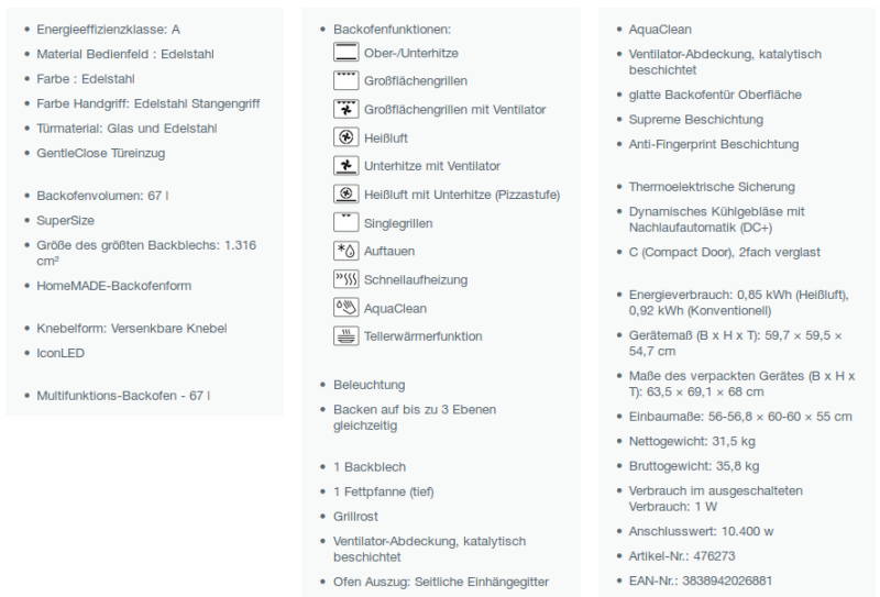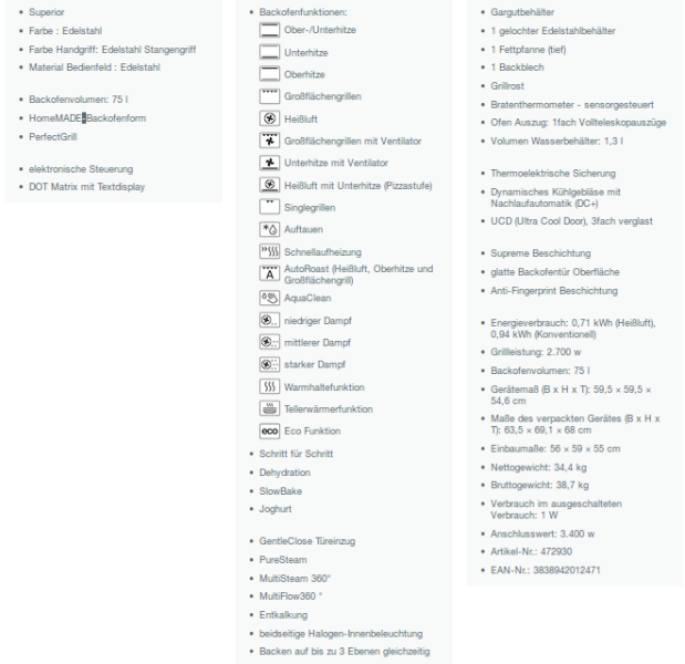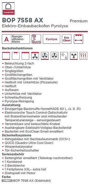 | Eigenschaften: | Glas mit Edelstahleinsatz Griff ergonomisch geformt Aushängbare Backofentür Garraum aus Edelstahl |