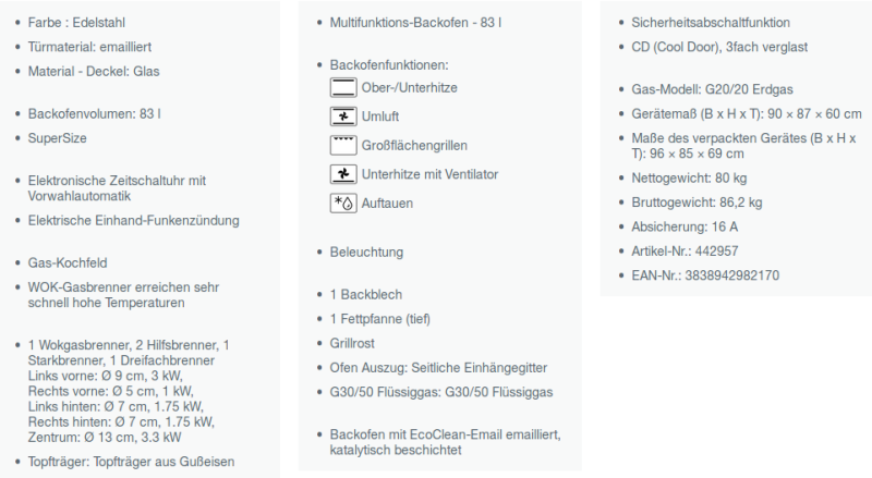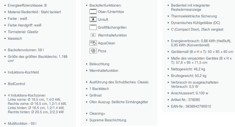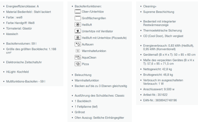 Energieverbrauch: 0,88 kWh (Heißluft), 0,95 kWh (Konventionell)