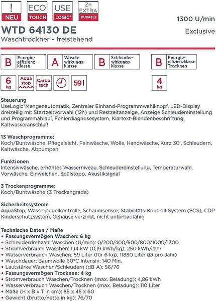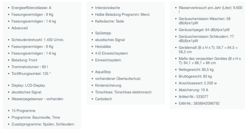 | Zusatzprogramme: | Display: LED-Display, Startzeitvorwahl (24h) |