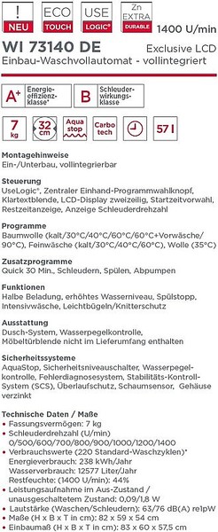 | Geräuschemission Waschen: | 58 dB(A)re 1 pW |
